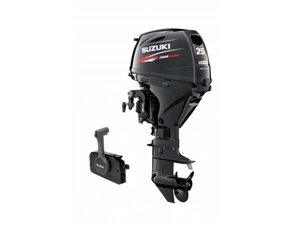 The 25 HP Suzuki outboard model # DF25ATL is equipped with every feature you might want. The 25 HP Suzuki outboard is first in class in weight and quietness. The state of the art green technology outboard is a battery-less, fuel injdected 4 stroke motor that has power left over for your larger and heavier jon boats, skiffs and sailboat applications. This model has the 20 in long shaft, electric start, power trim and tilt, remote steering and throttle, a 6 gallon external gas tank and gas line and the famous Suzuki 3 year factory warranty.